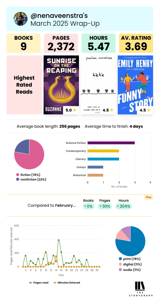 Het is lente, en de kriebels zijn begonnen! De leeskriebels bedoel ik, natuurlijk — de Boekenweek was deze maand, het vijfde boek in de Hongerspelen-serie van Suzanne Collins is gepubliceerd, en ik heb zin om heel veel te lezen. Dat heb ik dan ook gedaan; op het moment van schrijven heb ik 9 boeken gelezen in de maand maart, en ik heb nog drie dagen over om daar 10 van te maken. En slechts één van die boeken was voor Club Lees!